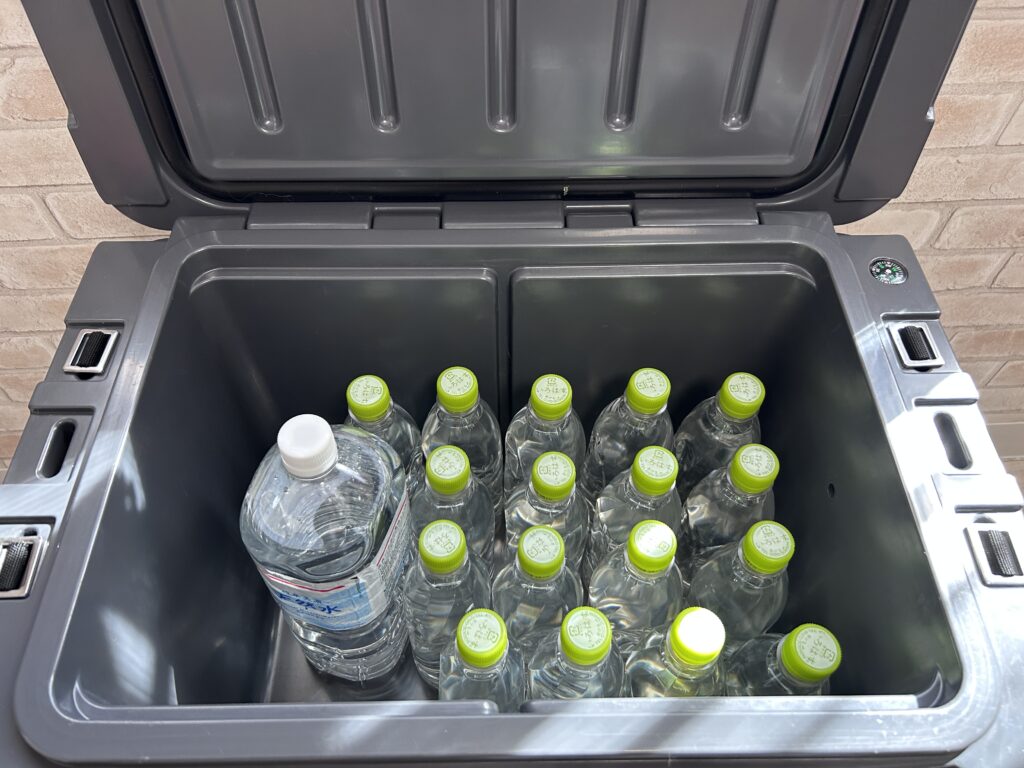 家にあるペットボトルかき集めて中に入れたクーラボックスをタフライトボックスの上に乗せてみました。