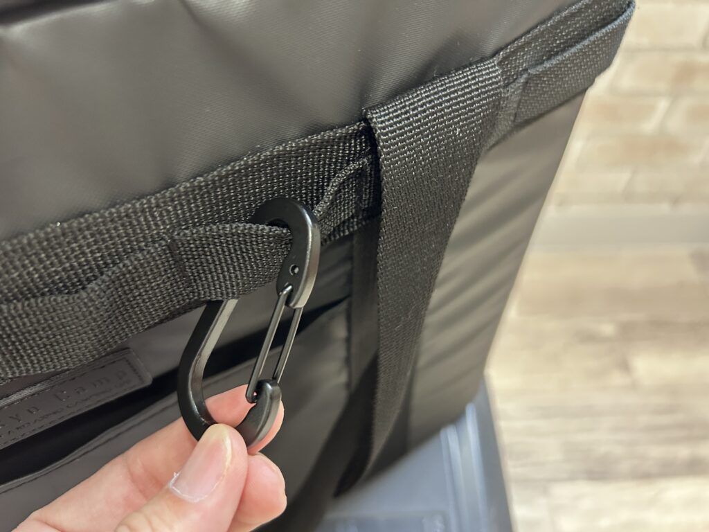 カラビナを引っ掛けてあるバンド部分は仕切られているので何かをひっかけたりカラビナを増やしたりすることで収納力アップが期待できる。